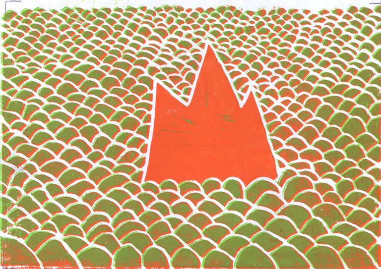 © bei den jeweiligen Künstler/-innen. Linoldruck, zweifarbig, mit verlorener Platte, im Druck mit Farb-Alternativen, Gym. Jg 06-07